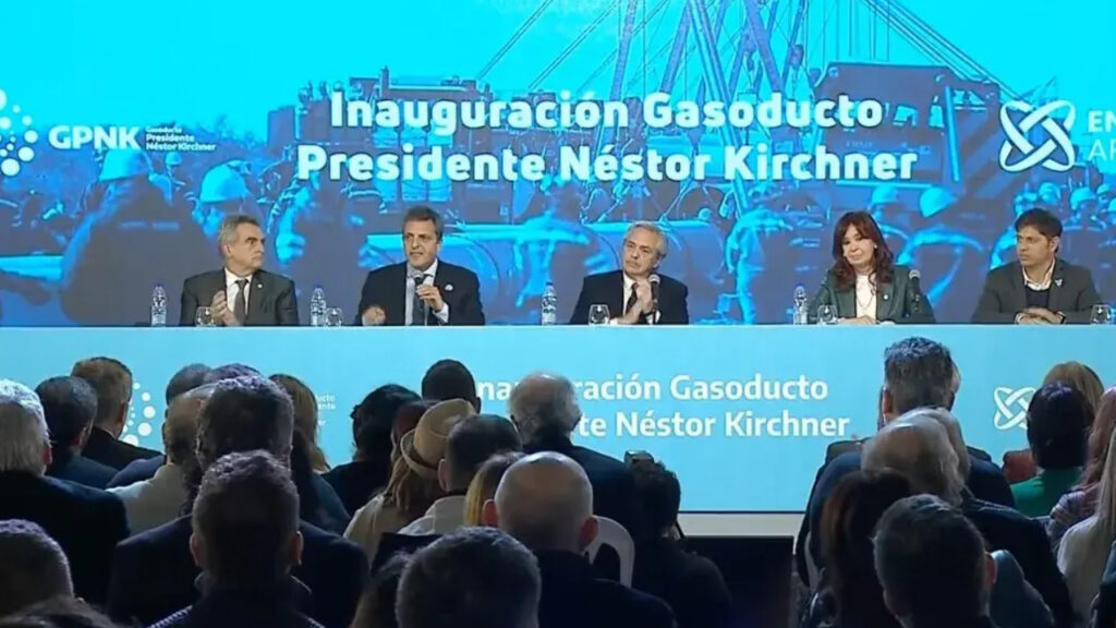 El presidente Alberto Fernández, la vicepresidenta Cristina Fernández y el ministro de Economía y precandidato presidencial, Sergio Massa, inauguraron este domingo el Gasoducto Presidente Néstor Kirchner en la ciudad bonaerense de Salliqueló con llamados a la «unidad» del peronismo y el reconocimiento de medidas de gestión que fueron relevantes para el desarrollo de la obra, como la nacionalización de YPF y la sanción del Aporte Solidario y Extraordinario a las Grandes Fortunas.