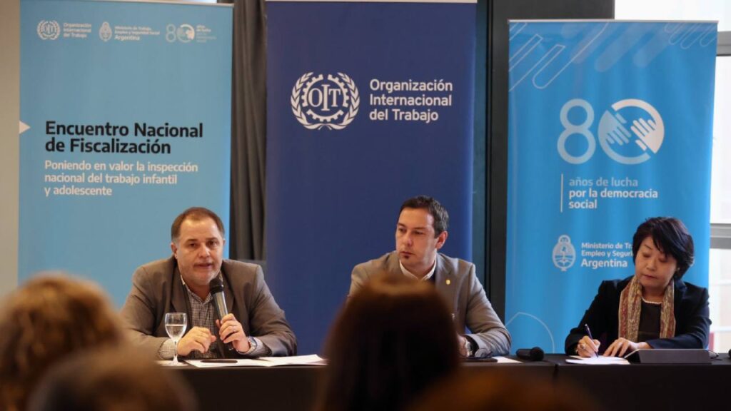 La ministra de Trabajo, Empleo y Seguridad Social, Kelly Olmos, junto a la directora de la Organización Internacional del Trabajo (OIT), Yukiko Arai; el subsecretario de Fiscalización del Trabajo del MTEySS, Sebastián Pilatti, y el secretario de Trabajo y Promoción del Empleo de La Pampa y presidente del Consejo Federal del Trabajo, Marcelo Pedehontaá, encabezaron el Encuentro Nacional de Fiscalización, que se desarrolló en dos jornadas y contó con la participación de autoridades nacionales y provinciales. En ambos encuentros se llevaron adelante paneles que tuvieron la finalidad de poner en valor la inspección nacional del trabajo infantil y adolescente.