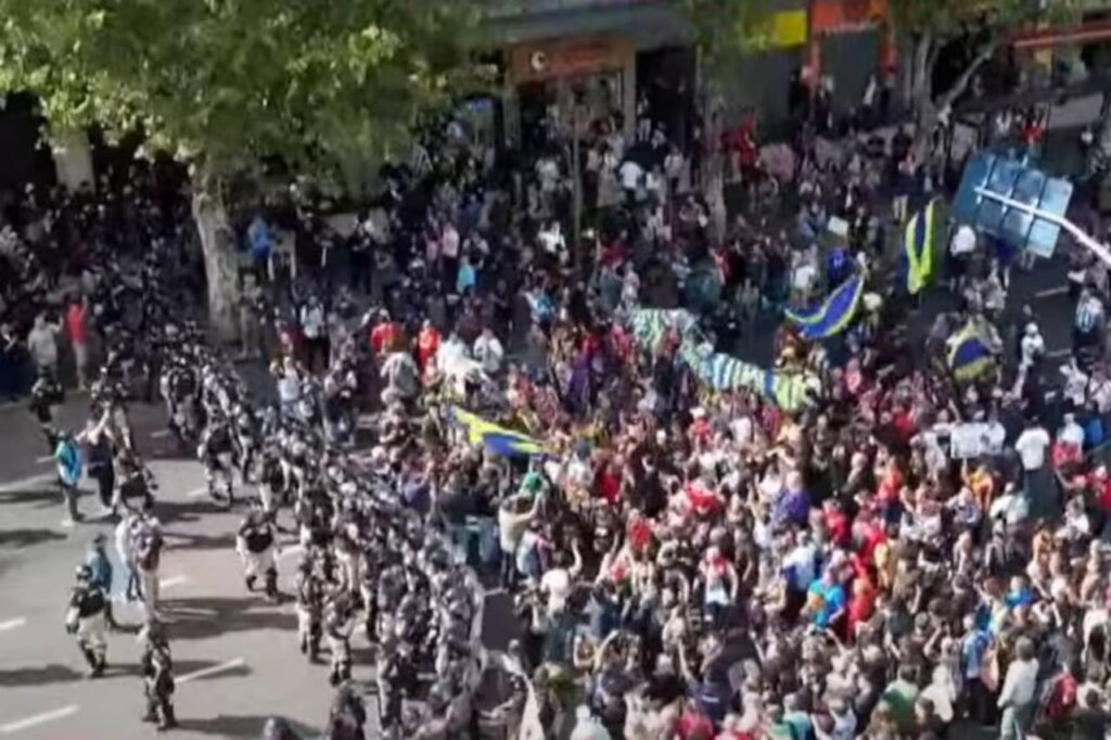 Alrededor de las 16, las Fuerzas de Seguridad avanzaron sobre el millar de hinchas y manifestantes que se habían reunido en la plaza frente al Congreso de la Nación y habían logrado cortar la Av. Rivadavia. En respuesta, se activó el protocolo antipiquete. Ahora hay represión con camiones hidrantes y gases. Hay policía motorizada.