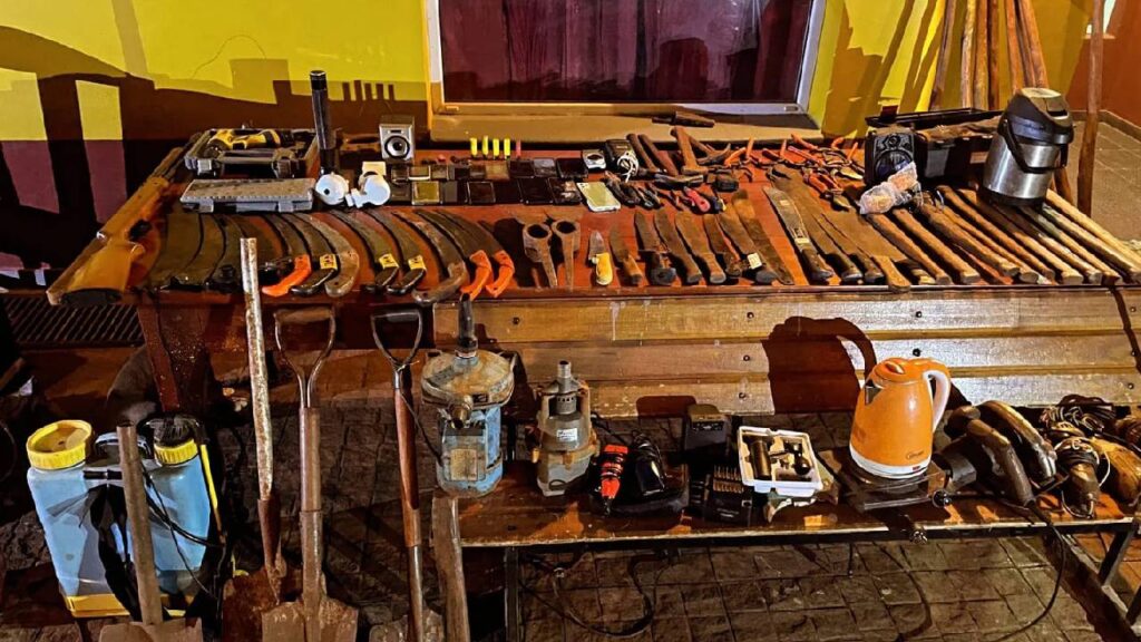 Durante el operativo, se incautaron 19 machetes, 8 azadas, 10 serruchos, 2 picos para excavar, 4 tijeras de poder, 17 teléfonos celulares de diferentes marcas, un lavarropas, una motosierra y varios equipos electrónicos.