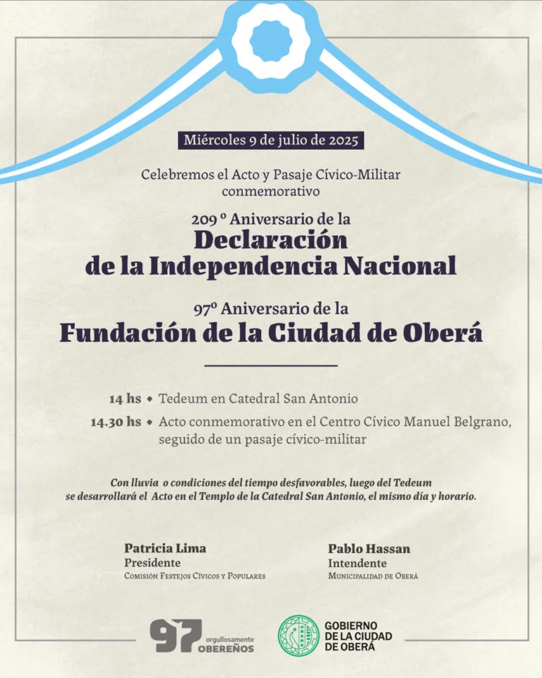 Argentina celebra el 209 Aniversario de la Declaración de la Independencia Nacional y el 97 Aniversario de la Fundación de la Ciudad de Oberá. En este aspecto, la Comisión de Fiestas Cívicas y Populares organizó el acto que será el miércoles a las 14h.