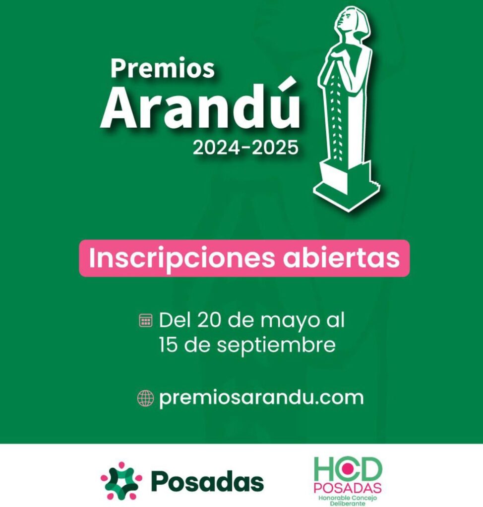 El Concejo Deliberante de Posadas lanzó la convocatoria para la edición 2025 de los Premios Arandú, el reconocimiento que celebra el talento y la diversidad cultural de la ciudad. Artistas individuales o grupos podrán inscribir -vía online o presencial- producciones realizadas entre septiembre de 2024 y septiembre de 2025 en las categorías de danza, teatro, música, letras, fotografía, artes visuales y artes audiovisuales.