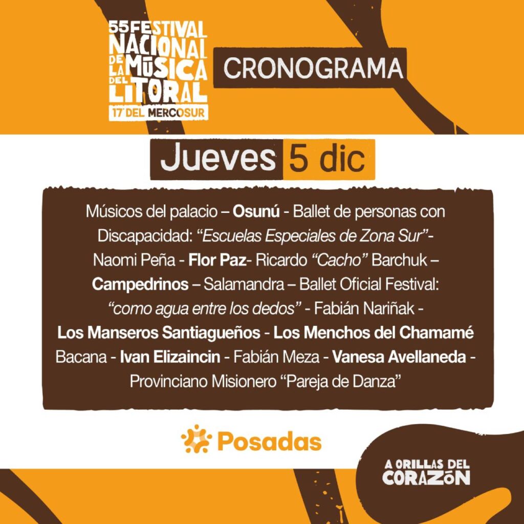 El viernes será el turno de El Chango Spasiuk, Los Mitá, Susana Moreno y las recién incorporadas Maggie Cullen y Marcela Morelo, quienes reemplazarán a Ángela Leiva. El sábado se presentarán La Delio Valdez, El Indio Rojas y Patricia Gaona. El cierre estará a cargo de Soledad Pastorutti, Los de Imaguaré, Lorena Larrea, Rulo Grabovieski y Lira Verá.