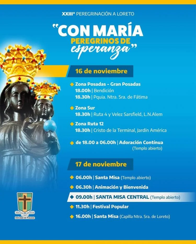 La Diócesis de Posadas convocó a la comunidad a participar en la XXIII° Peregrinación a Loreto, que se llevará a cabo los días 16 y 17 de noviembre. Bajo el lema Con María, peregrinos de esperanza, el evento promete ser un espacio de encuentro espiritual y reflexión.