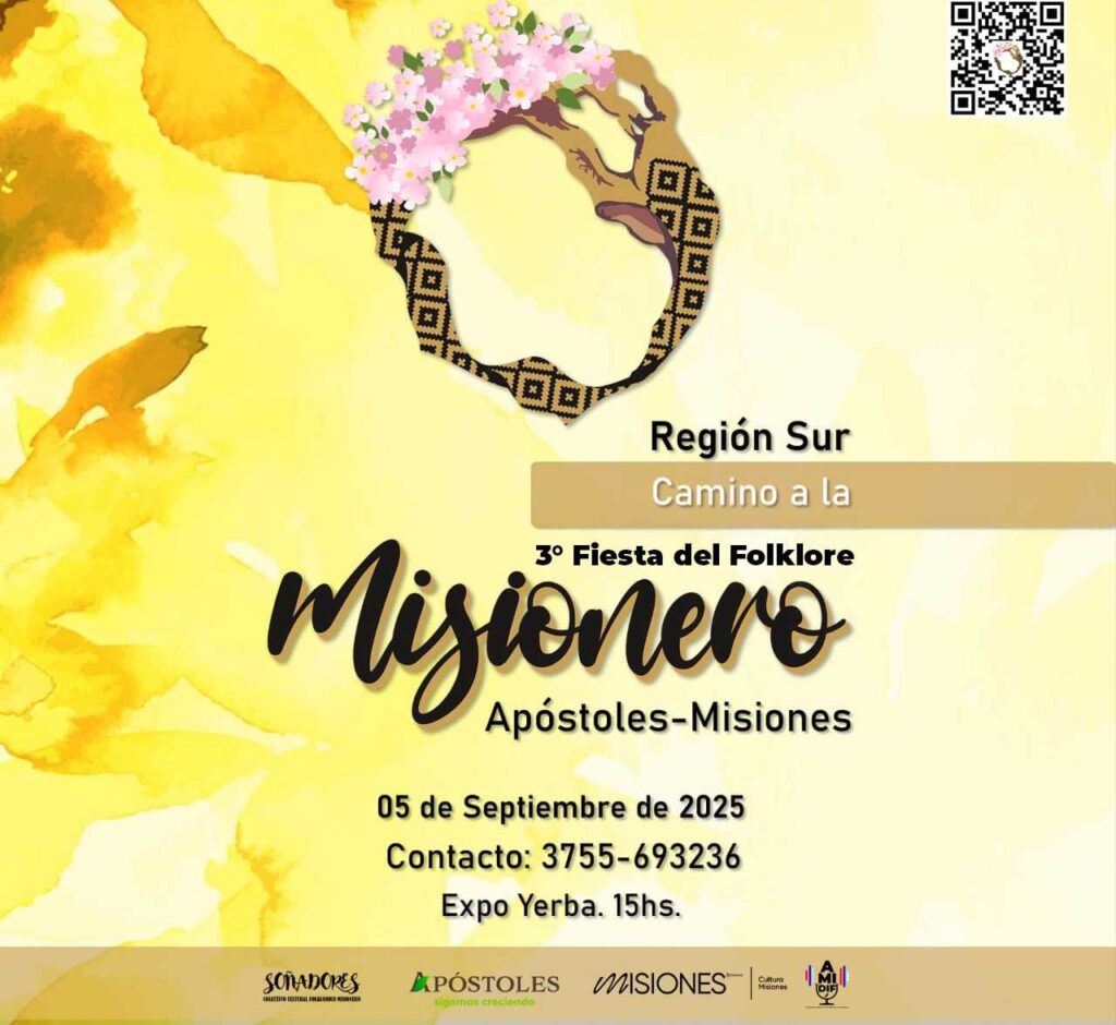 El próximo 5 de septiembre desde las 15:00 hs., la Expo Yerba en Apóstoles será el escenario del “Camino a la 3ª Fiesta del Folklore Misionero” en la región Sur. Este evento busca revalorizar las expresiones folklóricas de Misiones y destacar los rasgos identitarios de la provincia.