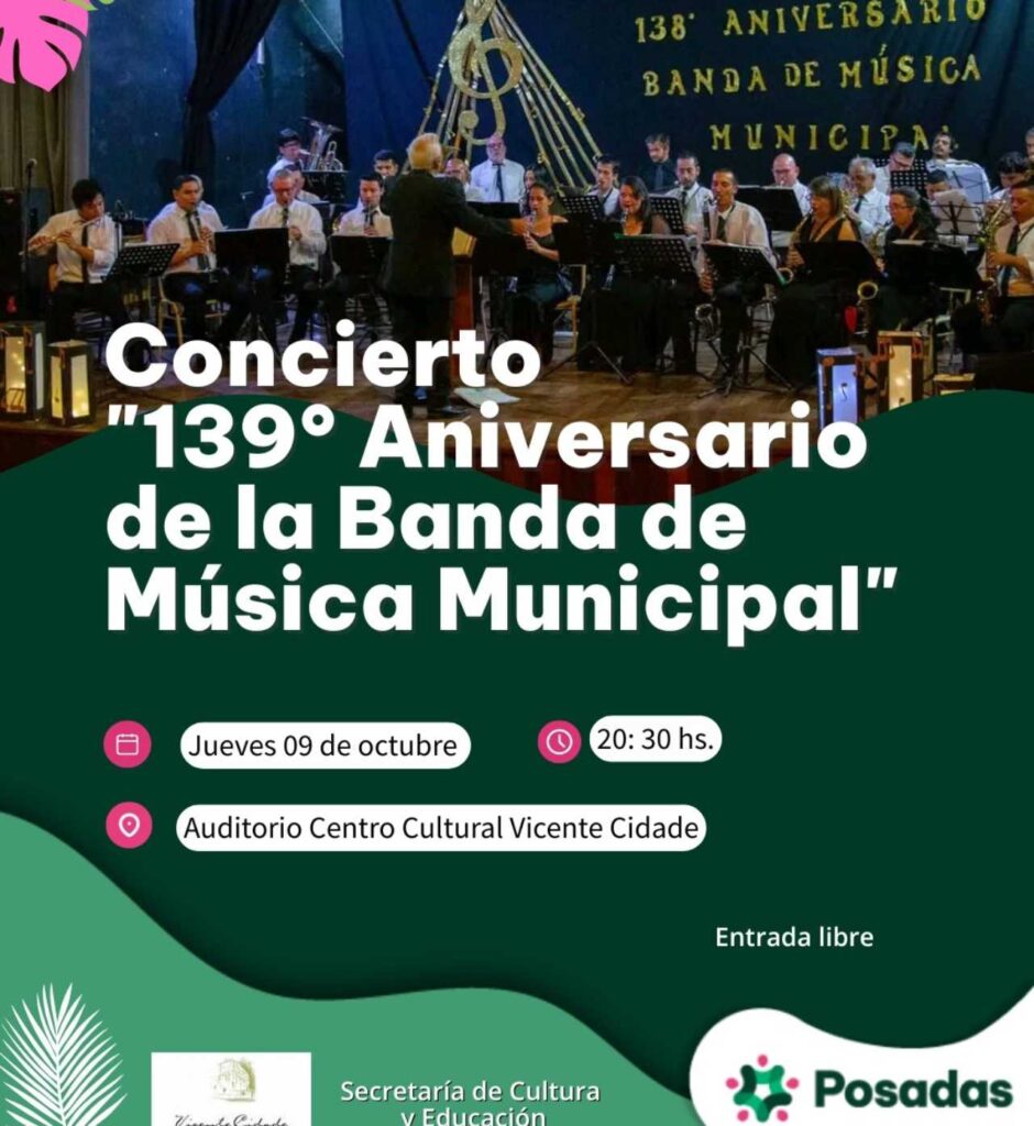 La Municipalidad de Posadas invita a toda la comunidad a participar del espectáculo con el que la Banda de Música Municipal celebrará sus 139 años de trayectoria ininterrumpida, reafirmando su rol como uno de los principales símbolos culturales y patrimoniales de la ciudad. La cita será en el Centro Cultural Vicente Cidade, donde los vecinos podrán disfrutar de una noche especial marcada por la historia, la emoción y la calidad interpretativa de una agrupación que acompaña la vida institucional y social de Posadas desde hace más de un siglo.