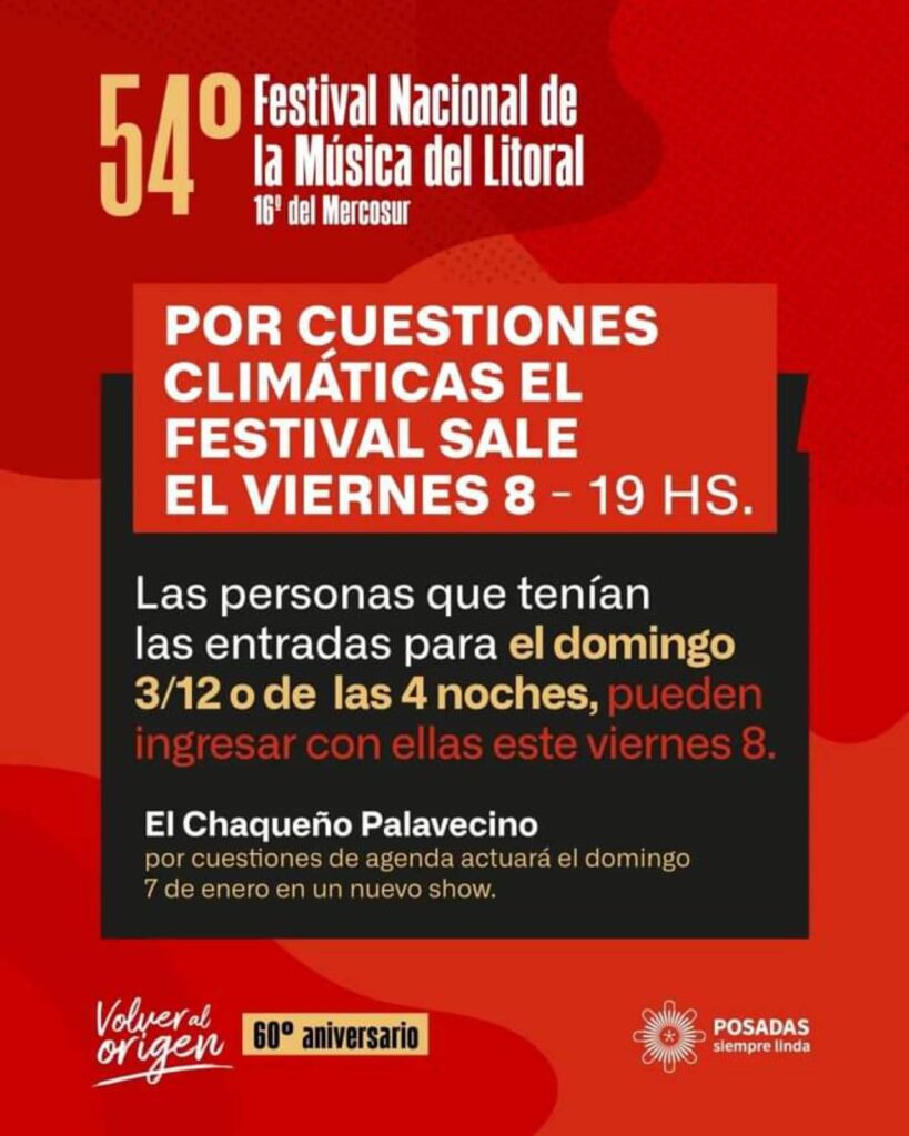 Por tal motivo el espectaculo de música y danzas litoraleñas, fue reprogramado para el viernes 8 de diciembre, a partir de las 19 hs. Una decisión que busca garantizar la seguridad y la experiencia completa para los asistentes. Es importante destacar que, debido a compromisos de agenda, la presentación del reconocido Chaqueño Palavecino se trasladará al 7 de enero en un nuevo espectáculo.