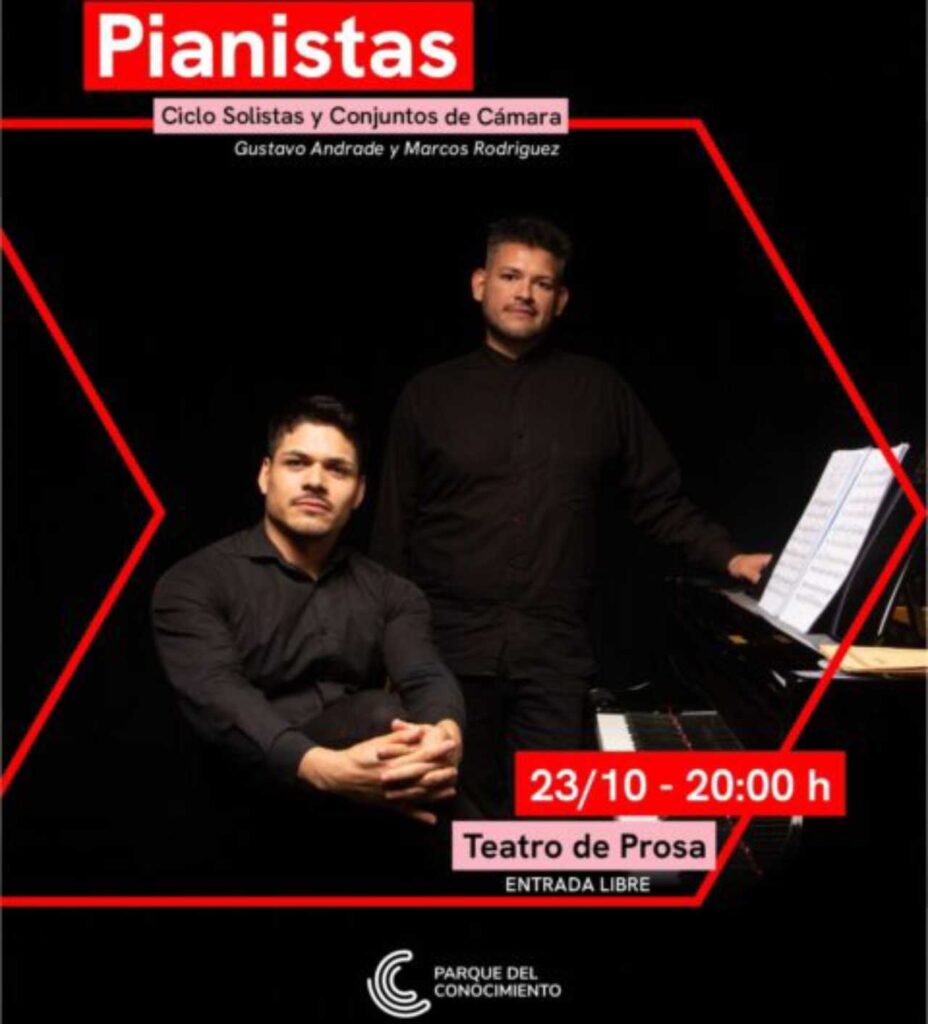 El Parque del Conocimiento invita a una nueva edición del Ciclo Solistas y Conjuntos de Cámara, una velada dedicada exclusivamente al piano con un destacado repertorio y grandes intérpretes de la escena local: Gustavo Andrade y Marcos Rodríguez. La cita es para el jueves 23 a las 20 en el Teatro de Prosa, con entrada libre.