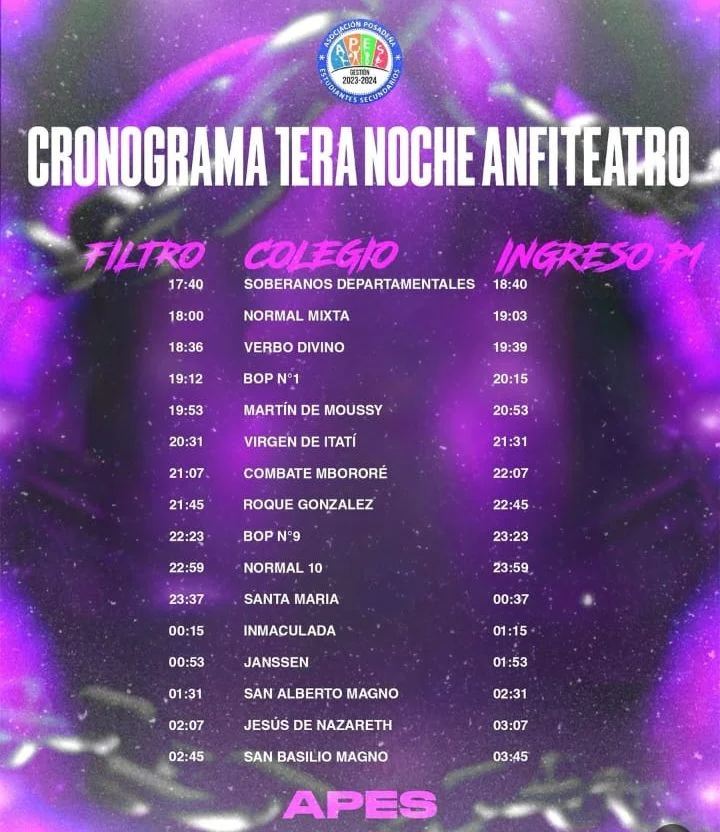 Los estudiantes posadeños se preparan para vivir el cierre de una nueva edición de su popular celebración: la Estudiantina. Este jueves, la Asociación Posadeña de Estudiantes Secundarios (APES), dio a conocer el cronograma de la primera jornada del tradicional Show de Scolas, que se celebrará este viernes en el mítico Anfiteatro Manuel Antonio Ramírez.