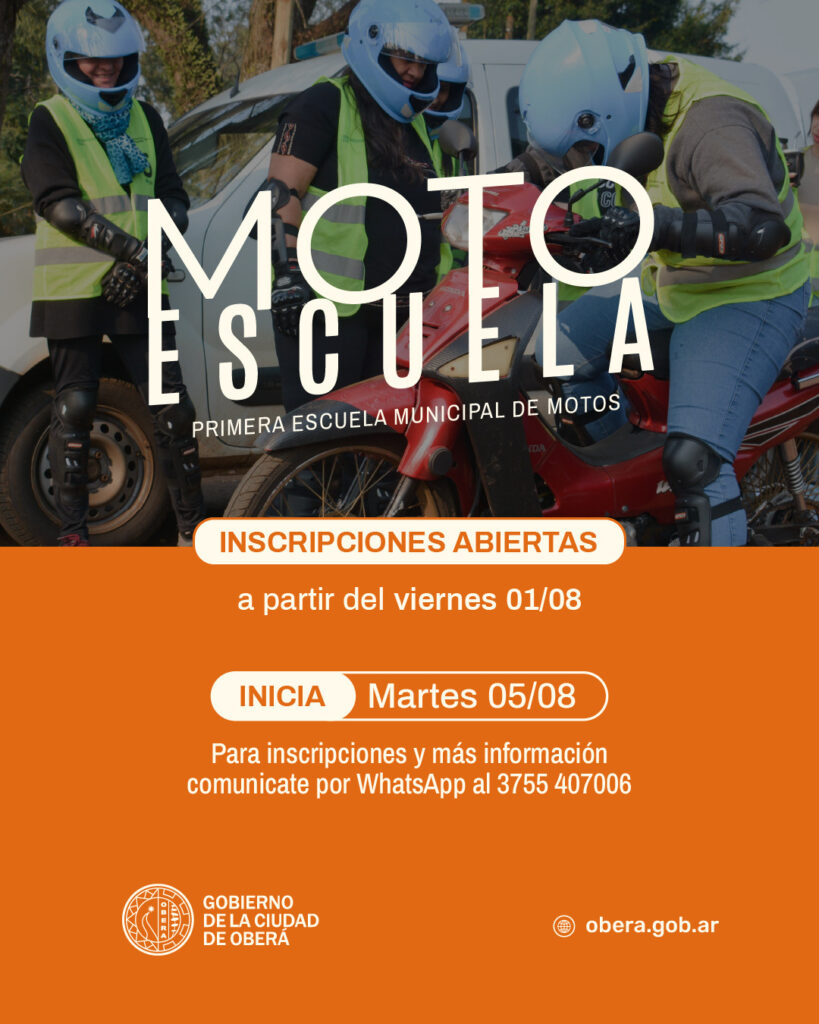 El Gobierno de la Ciudad de Oberá nuevamente abrió las inscripciones para la Moto Escuela Municipal, que son cursos gratuitos de capacitación e instrucción para personas que deseen aprender a manejar motocicletas. El curso está dividido en 8 clases, teóricas y prácticas, con cupos limitados.