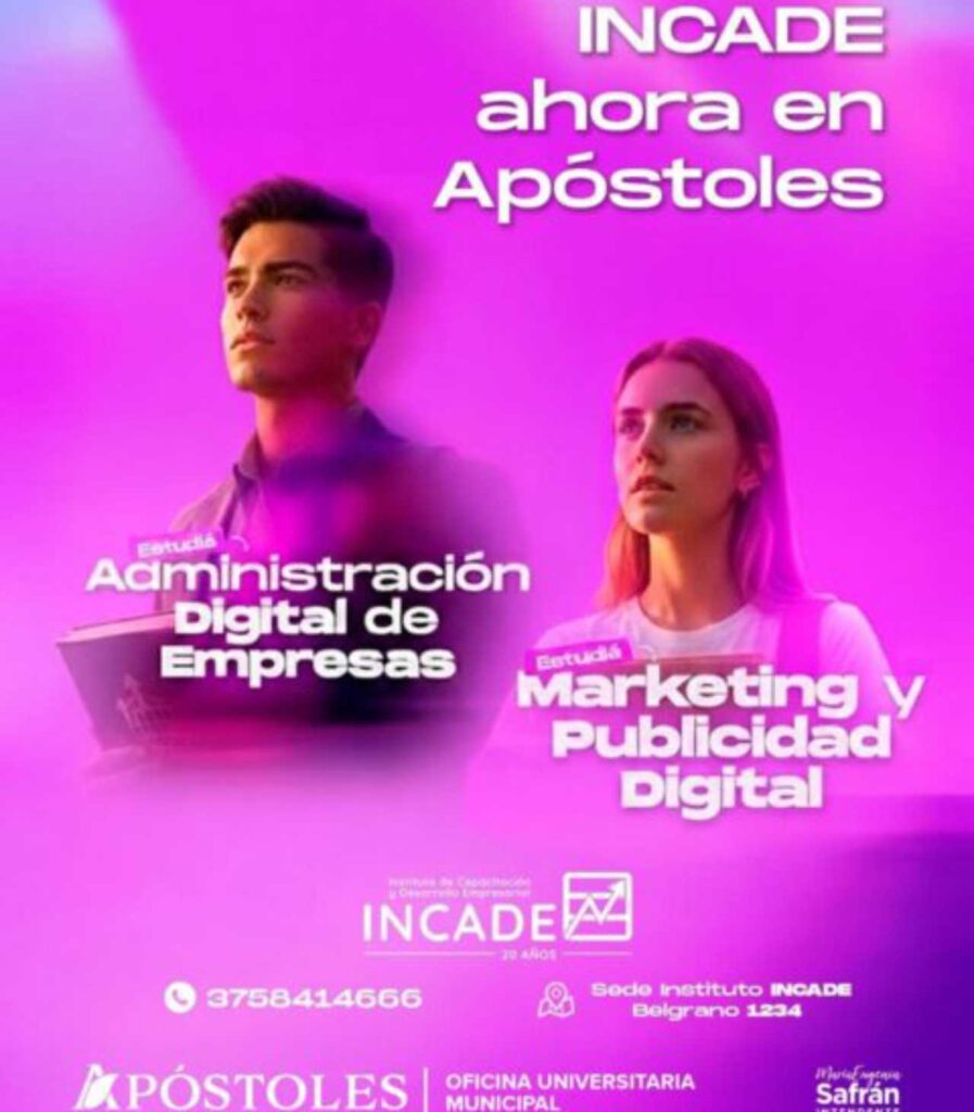 Desde la Oficina Universitaria del Municipio de Apóstoles se informa a la comunidad que el Instituto INCADE ya se encuentra presente en la ciudad, ampliando la oferta educativa con dos carreras innovadoras orientadas al mundo digital y a los nuevos desafíos del ámbito laboral.