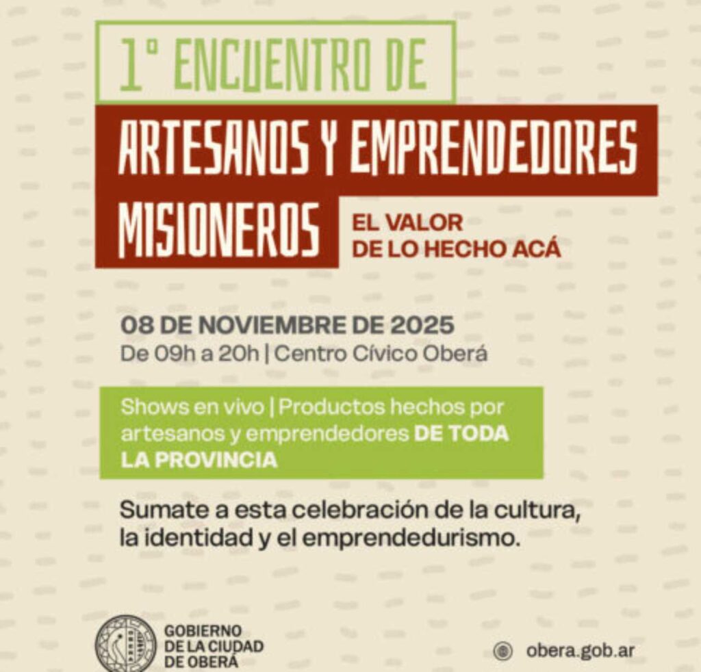 El próximo sábado 8 de noviembre, el Centro Cívico de Oberá será el escenario del 1° Encuentro de Artesanos Emprendedores Misioneros, una jornada que reunirá a artesanos y emprendedores de toda la provincia para celebrar la creatividad, la identidad y el talento de las manos misioneras.