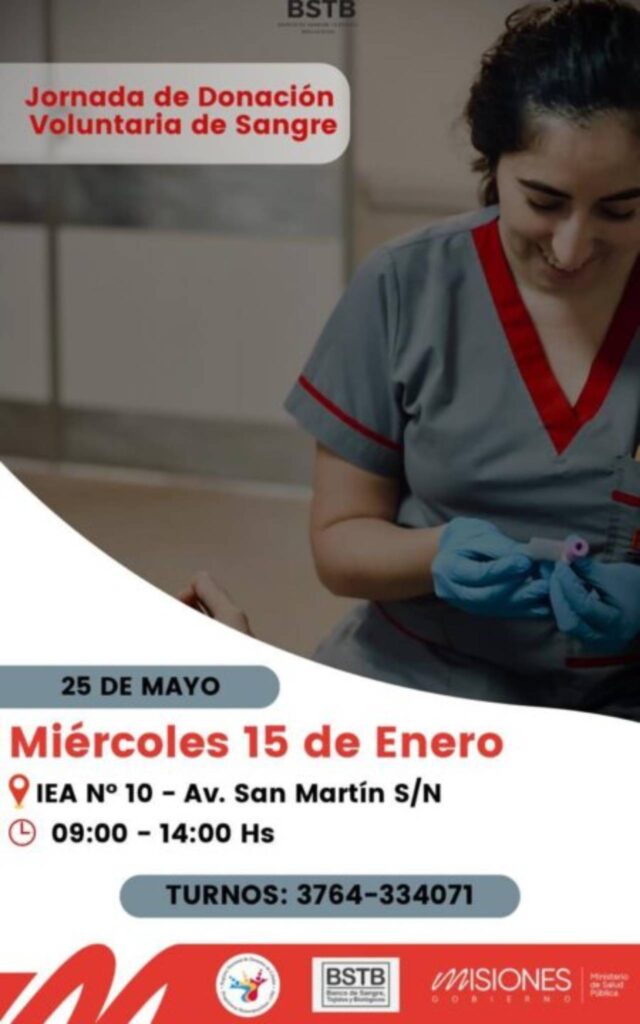 Con el fin de mantener el stock de reservas en sangre del sistema sanitario provincial siendo este recurso utilizado para tratar enfermedades, realizar intervenciones quirúrgicas, trasplante de órganos y tratar accidentes, hemorragias o quemaduras, se van a estar realizando jornadas de donación voluntaria en las localidades de San Vicente, Profundidad, Posadas, 25 de Mayo y Candelaria.